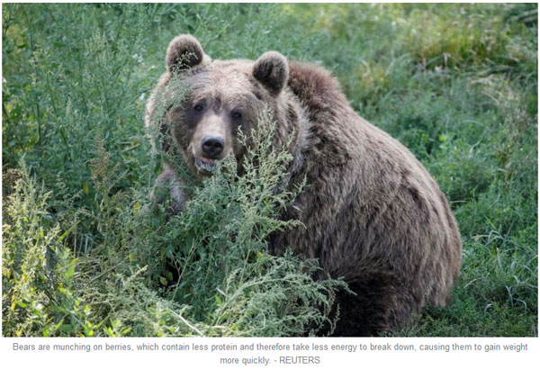 但是,它們一反常態,跑到山上大吃漿果。漿果里面的蛋白質含量低,消化分解所需能量少,因此它們長胖的速度也加快了。