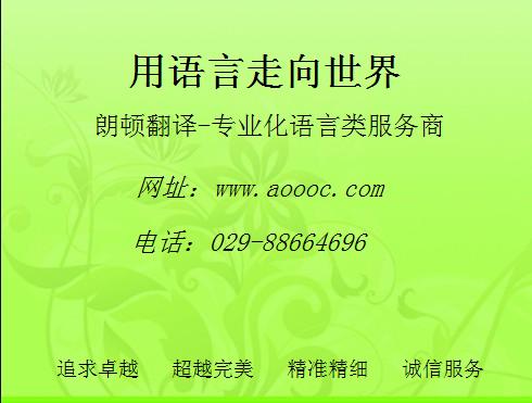 朗頓翻譯是由國家工商局批準的專業涉外翻譯服務公司【涉外備案章編碼:610100100424980】,是國內首批5家擁有專業涉外翻譯服務的機構,公司經公安局特批中英文“翻譯專用章”,可提供權威的涉外翻譯服務。公司匯聚了78種語言筆譯和26種語言口譯英才,為您提供各類證件及證明翻譯服務,快速準確、費用低廉,符合國際通行的標準,翻譯蓋章得教育部、外交部、司法部、法院、各國使館認可,暢通全球。