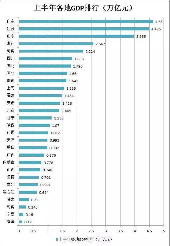 Guangdong province’s first half GDP reading of 4.634193 trillion yuan put it first out of the 28 provinces that have released data, followed by Jiangsu province in second place, with a figure of 4.48635 trillion yuan.